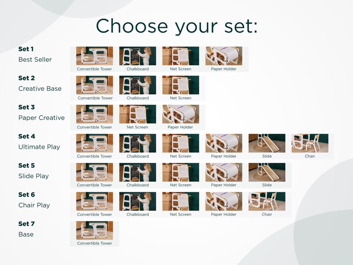 - 🌿 Eco-Friendly 8-in-1 Design: Toddler tower, Table and chair, Extra chair, Step stool, Chalkboard, Kids Slide, Paper station